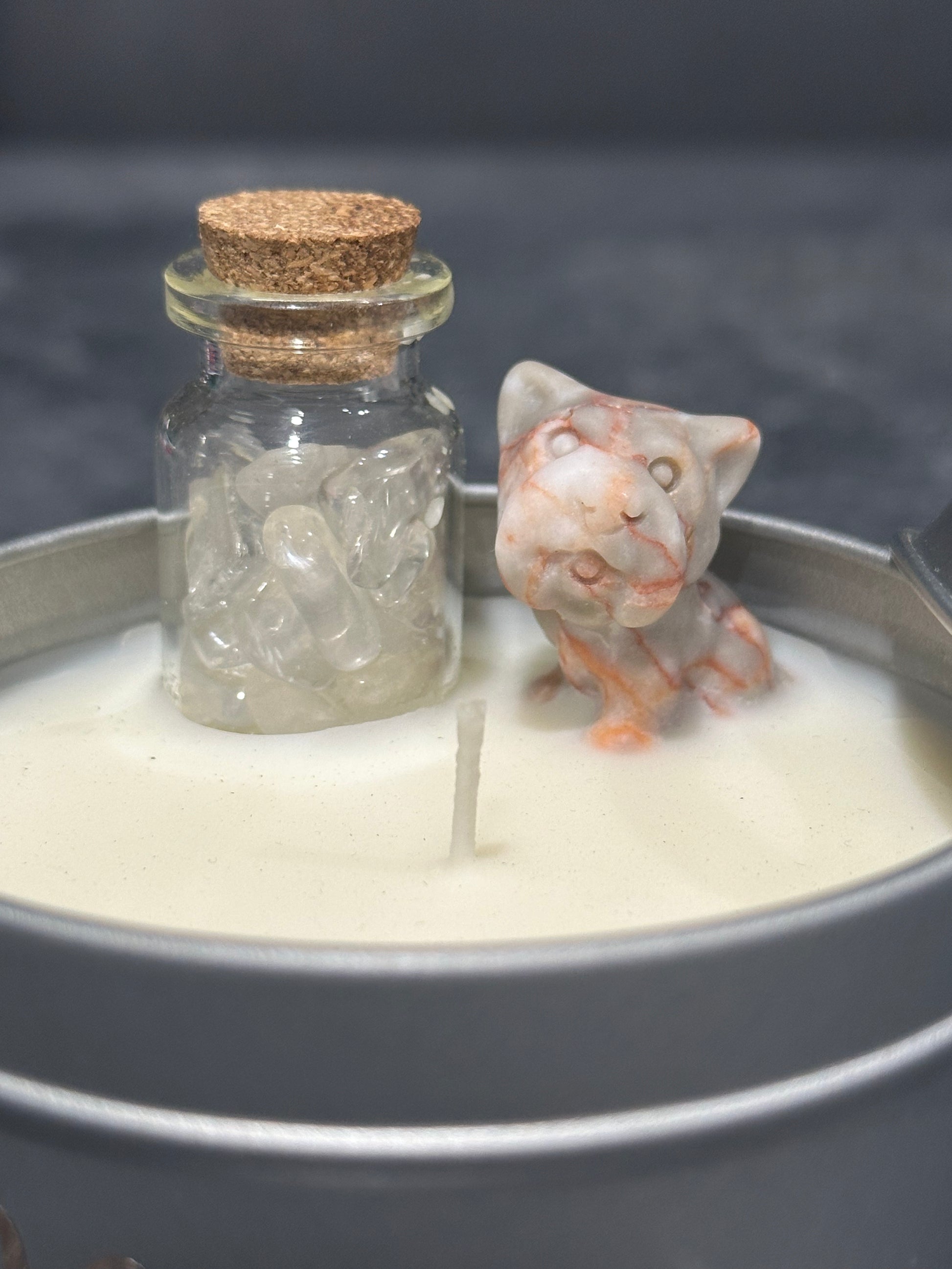 CLARITY candle infused with Crazy Lace Agate dog and Clear Quartz chip bottle